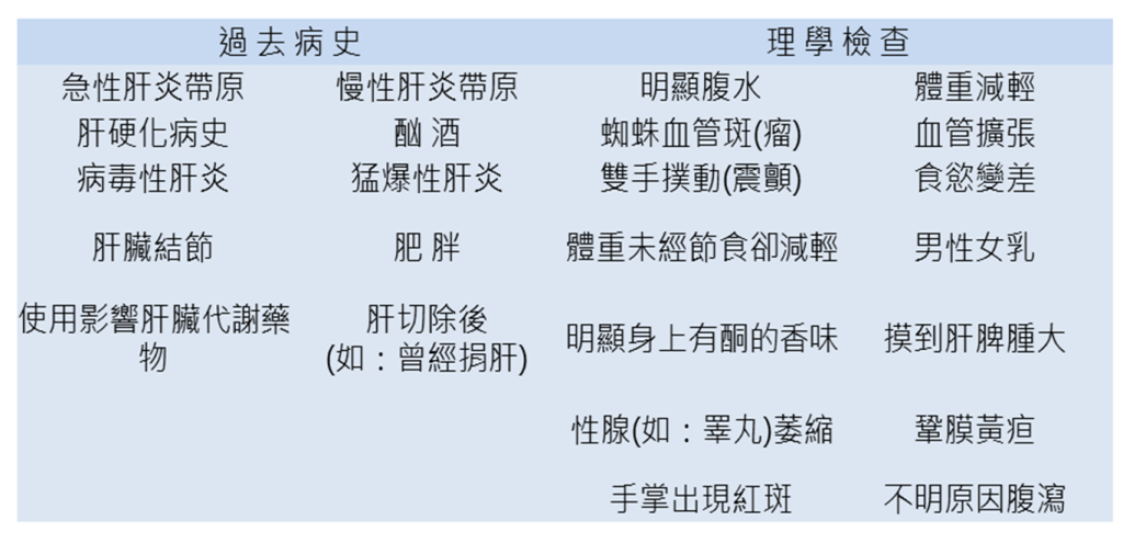 非酒精性脂肪肝疾病的發現通常是一般公司年度健康檢查時GPT(ALT)或腹部超音波篩檢發現異常,經過病史詢問和理學檢查,排除酒精造成的肝臟疾病或肝炎帶原造成的肝臟問題後,可以進一步診斷為非酒精性脂肪肝疾病所造成肝功能異常,排除臨床症狀如下[8]: