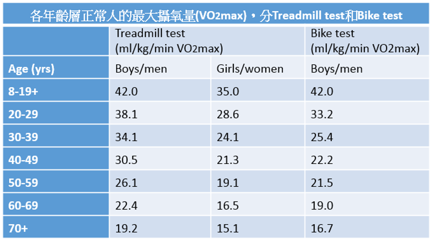 表一、各年齡層的最大攝氧量(低於此數值要考慮亞健康狀態)