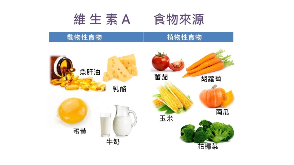 1.維生素A 幫助維持正常視覺,保護夜間視力,預防夜盲症