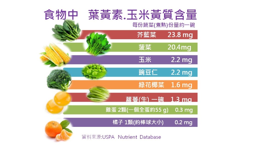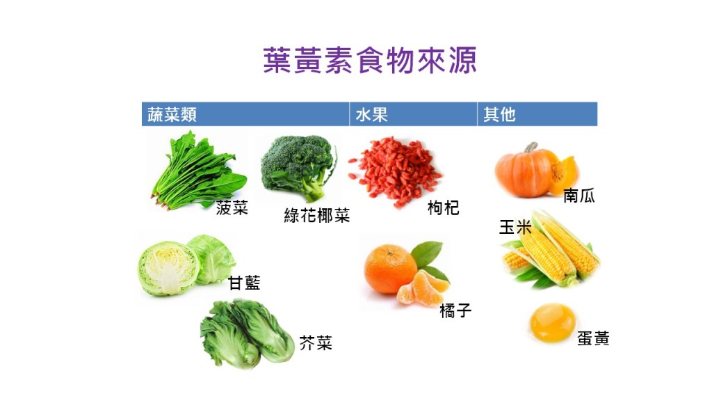 根據1994年美國哈佛大學研究,發現每天攝取6毫克的葉黃素可減輕老年性黃斑部退化。建議蔬菜選擇至少有一個拳頭量是深綠葉蔬菜 ,並搭配1茶匙油一起烹調,提高吸收率。