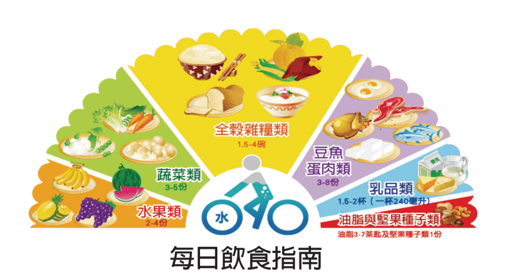 在2018年衛生福利部國民健康署評估國人飲食習慣及營養攝取狀況後,發布最新版為國人量身打造的「每日飲食指南」。「每日飲食指南」為一扇型圖示,將食物分為六大類,由左而右分別為水果類、蔬菜類、全榖雜糧類、豆魚蛋肉類、乳品類及油脂與堅果種子類。每日飲食指南重點在於強調「均衡飲食」概念,每一大類食物按照個體差異都應該適量攝取,營養才會均衡,沒有什麼食物不能吃,重點在於吃的份量要控制。