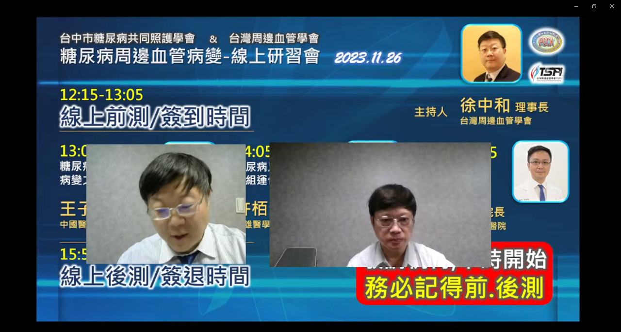 112/11/26 糖尿病周邊血管病變-線上研討會 分類:糖尿病共同照護學會2023-12-282023-12-28發表於活動剪影 上課時間:112年11月26日(星期日)13:05~15:55 主辦單位:台中市糖尿病共同照護學會 報名人數:224人 分享此文: 按一下即可分享至 X(在新視窗中開啟) X 按一下以分享至 Facebook(在新視窗中開啟) Facebook 喜歡 正在載入... 相關 發表者:糖尿病共同照護學會 本會為依法設立,非以營利為目的之社會團體,以從事糖尿病共同照護之推動,並促進糖尿病人之持續照護,強化國民之健康為宗旨 檢視更多文章