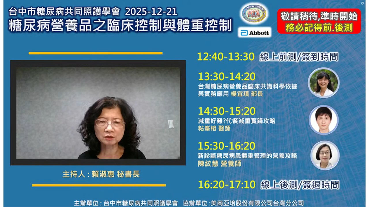 114/12/21 糖尿病營養品之臨床控制與體重控制-線上研討會 分類:糖尿病共同照護學會2025-12-23發表於活動剪影 上課時間:114年12月21日(星期日)pm14:30~pm16:20主辦單位:台中市糖尿病共同照護學會參與人數:188人 分享此文: 按一下即可分享至 X(在新視窗中開啟) X 按一下以分享至 Facebook(在新視窗中開啟) Facebook 喜歡 正在載入... 相關 發表者:糖尿病共同照護學會 本會為依法設立,非以營利為目的之社會團體,以從事糖尿病共同照護之推動,並促進糖尿病人之持續照護,強化國民之健康為宗旨 檢視更多文章