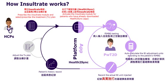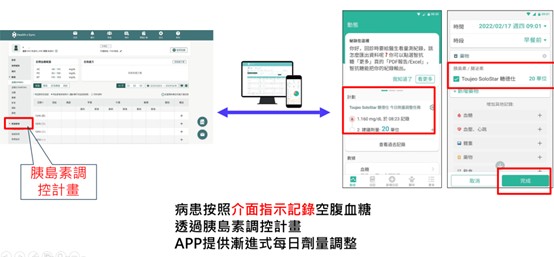 實際操作上,可分成四個階段:一、醫師在診間開立易速胰醫囑,僅需決定病人個別化血糖目標範圍、胰島素起始劑量、及選擇預設模版;二、衛教師協助病人手機下載智抗糖APP,並將個別化醫囑輸入模版中,啟動「胰島素調控計畫」;三、病人回家每日量測空腹血糖並輸入智抗糖APP,即可得到即時的胰島素劑量建議;四、衛教師於後臺查看病人血糖控制情形及胰島素調整情形,並隨時關懷。